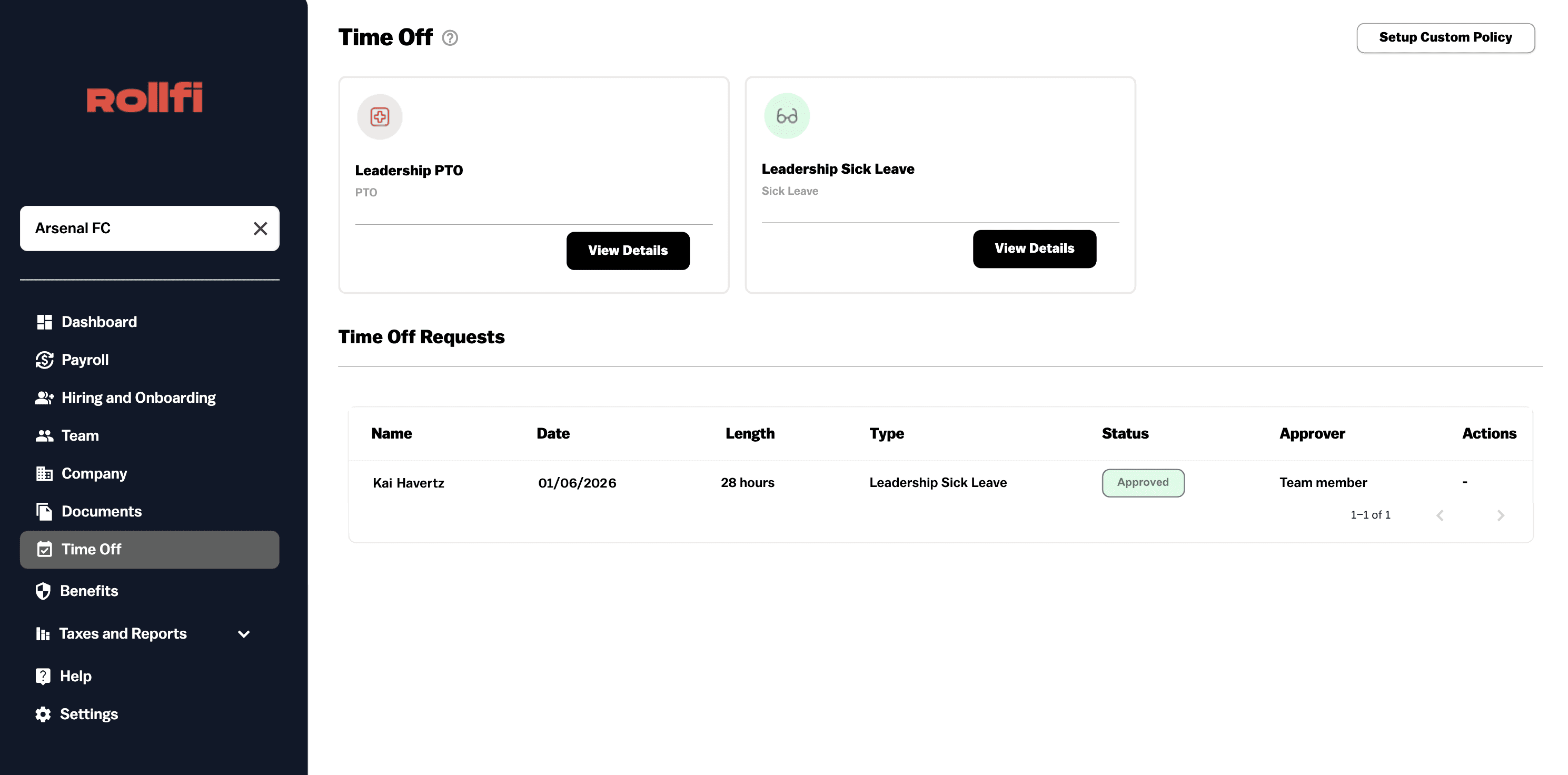 Let employees request time off from inside Rollfi, while admins can approve or deny in just a few clicks.